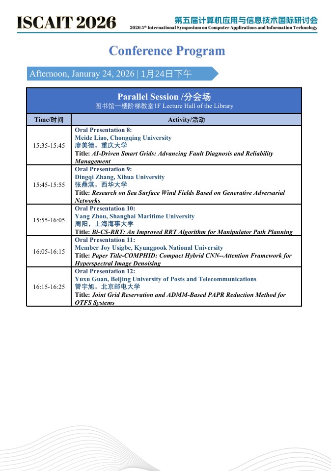 第五届计算机应用与信息技术国际研讨会(ISCAIT 2026),将于2026 年 1 月 23 日 - 25 日在香港城市大学(东莞)举办。这是计算机与信息技术领域的重要国际学术会议,旨在为全球学者、行业专家和青年学生搭建前沿的交流平台,分享最新研究成果与技术进展。诚邀我校师生拨冗参加!现将有关事项通知如下: